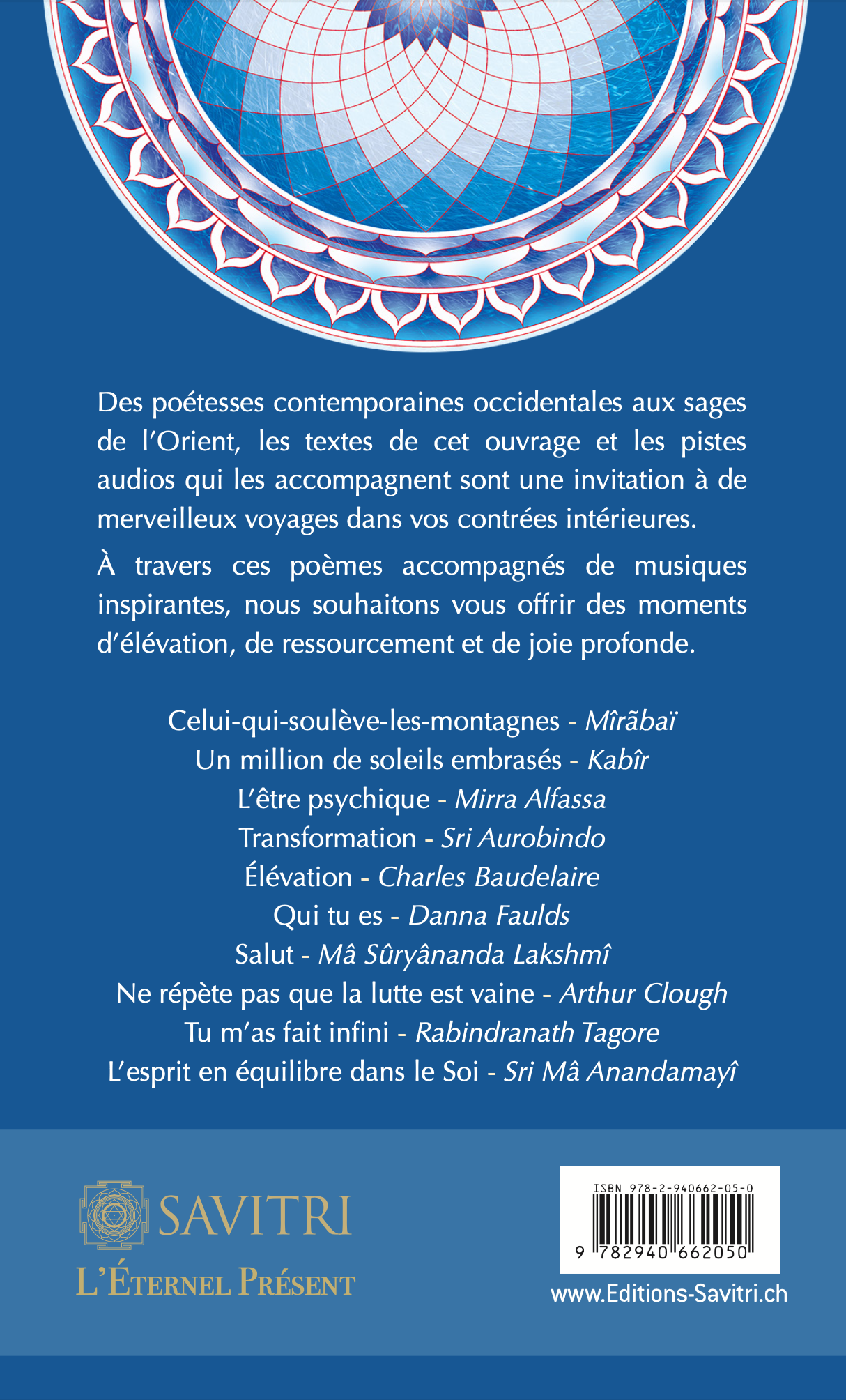 Des poétesses contemporaines occidentales aux sages de l’Orient, les textes de cet ouvrage et les pistes audios qui les accompagnent sont une invitation à de merveilleux voyages dans vos contrées intérieures. À travers ces poèmes accompagnés de musiques inspirantes, nous souhaitons vous offrir des moments d’élévation, de ressourcement et de joie profonde.