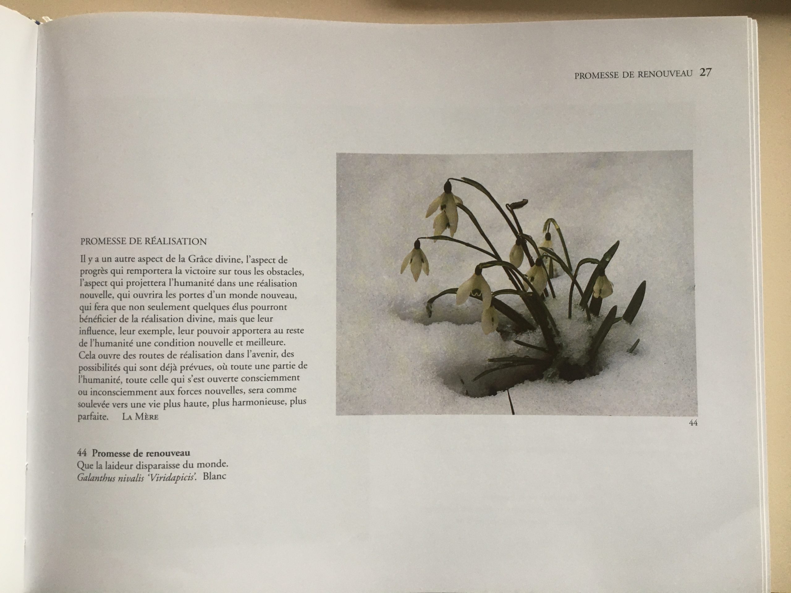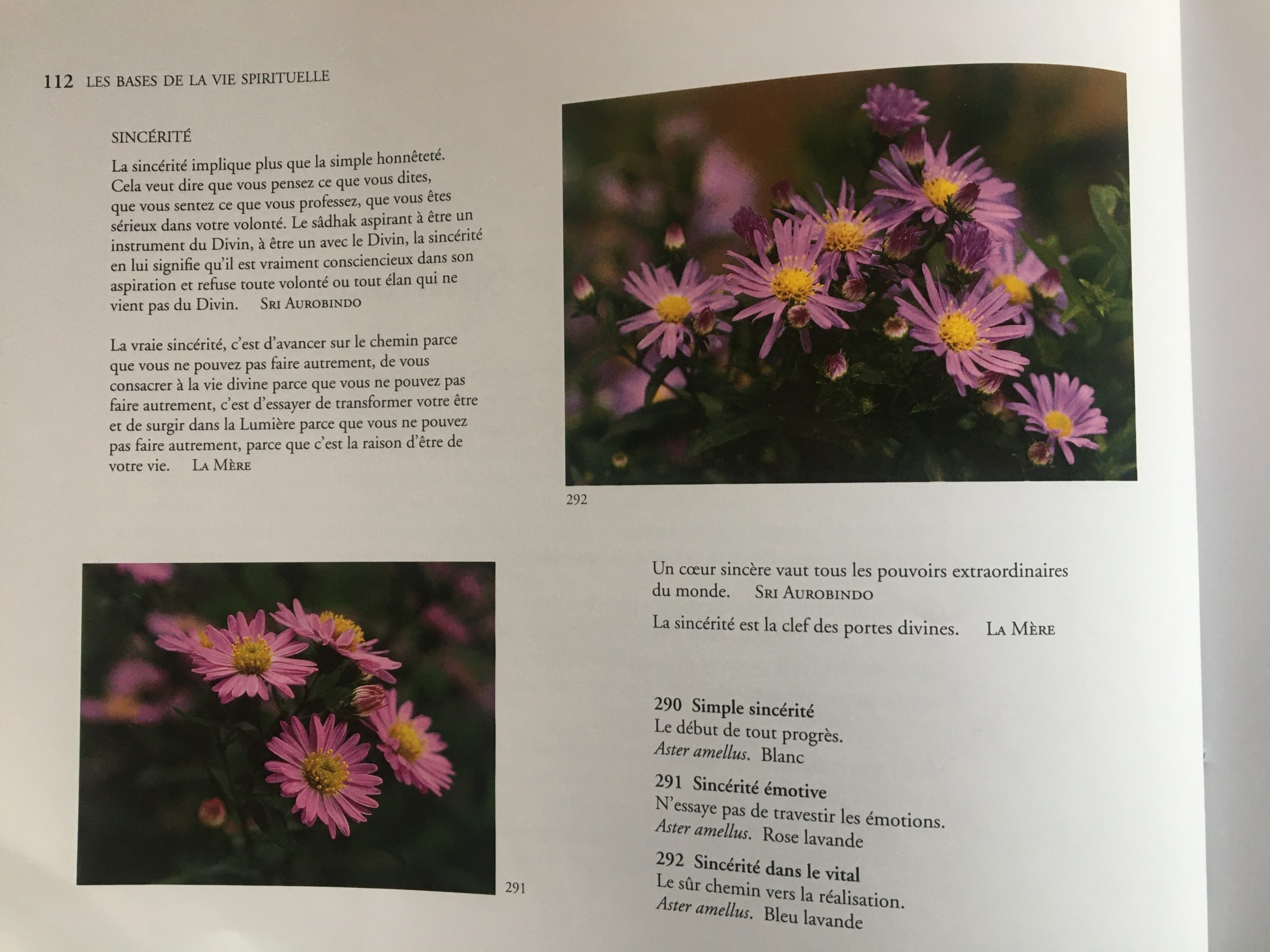 Délicates, pleines de charme, les fleurs partagent avec nous leur beauté et nous apportent le parfum des choses éternelles. Chaque variété, nous dit Mirra Alfassa, possède sa qualité propre, sa signification particulière. Tout au long de sa vie, Mirra Alfassa a donné des «noms» ou «significations» à 898 fleurs. Dans ce livre, les fleurs et leurs significations sont arrangées par thèmes en douze chapitres. De brèves citations permettent d’en mieux saisir le sens. 630 photographies en couleurs aident à identifier les fleurs et révèlent leur beauté. Dans un deuxième volume ont été réunis les index, les glossaires, les descriptions des fleurs et les informations botaniques.